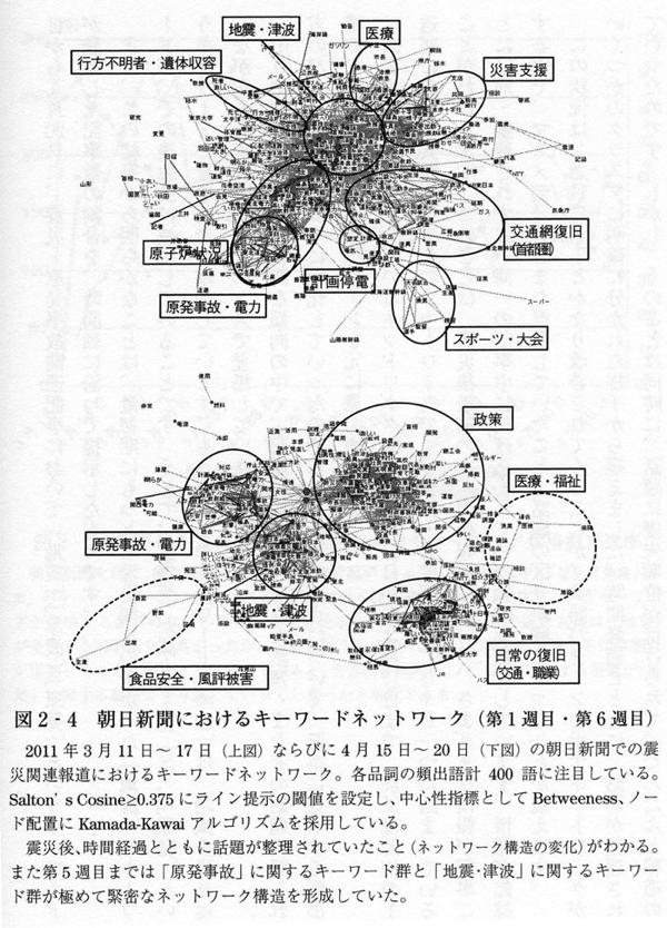 これは、朝日新聞におけるキーワードネットワークというもので、地震直後と4月の様子を比較すると情報がひとつのところに固まっているようなイメージから、少しずつ区分けされて整理されていることがわかるのですが、すごく興味深いです。どうやって処理したのか、ぜひ詳しく知りたいです。