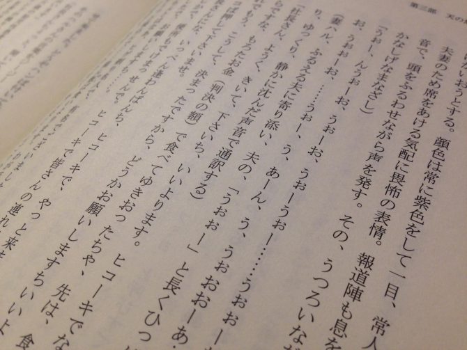 「日鼻立ちのつくりがおおきく出来ているだけに、患者たちの言葉を浴びるたんびに、だんだんとその表情からは生気が抜けて行き、むなしく、立派に、そこに置かれていた。ことにおおきなその目は判断を停止したような暗鬱な色になっていて、社長の補佐役であろう入江専務の方を瞬きながら幾度もふりかえった。」『天の魚 第三章 鳩』