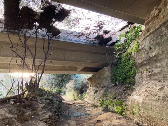 応接間を出て居間に出る、6畳と8畳をつないだ部屋で床の間や縁側も含めたら20畳はあろうか。お兄さんの肖像画、相模原での殺人事件の現場のすぐ近くにある相模川の風景画や佐々木さんの文章などが展示されている。その文章は昨年の7月末に書かれたものだった。相模原での殺人事件から崇高の問題にアプローチされていて、3年前にテートブリテンに通って近世絵画を見ていた時間と重ねてながら見ていた。庭をうろうろして、戻ったところで男性に腕をたたかれて呼び止められる。その人が佐々木さんだった。立ち話からソファに座って展示の話や障害者教育の動向など長話をする。ソファの真向かいにある、観覧車やジェットコースターの描かれたこんもりした森の風景は雲の重厚感がかなり出ていて何かを押しつぶそうとしているようだった。それは足場工事に使われる建地のようなものに絵画をかけていたが、横にある相模川の絵画と方位の関係をもっていると言われたとき、絵画と絵画のあいだにあるはずの描かれなかった風景が現前されてくる。途中、横浜美術館の方々がこられたのと、外の空気を吸いたくなったので佐々木さんと別れて朝夷奈切通まで歩いていく。ちょうどがっしりした靴だったので歩きたくなったのだった。民家のある途中まですれ違う人たちがみんな挨拶をしてこられるので、わたしも頭を下げる。なかなかないことだ。切通は傾斜があり、ぬかるみも多い。すり減った鎌倉石から石から飛び歩いていく。シダとシダのあいだを歩いていく。頂上には仏像が刻まれた岩とニッチな空間。次第に体が重くなりそうだというところで、高速道路と切通が交差しているところがゴールだ(このポストの上の写真がそれ)。古道と近現代という時代の全く違う道。人が歩く道。車が風景をキャンセルして走り抜ける道。コンクリートと鉄でできた、自然をはねつけようとする道。あちこちに石がコロコロしているボコボコした道。あるいはこうとも言えるだろう。障害者として生まれなかった人が歩いていく道と、一生において障害者である人が歩く道。どちらがそうかはわからない。でも、2つの道が間違いなくあった。それは障害者をめぐる制度的な意味もあるが、たんにその人間の運命である。生まれた時に自分の耳が聞こえていたら、現在のわたしが歩いていない一方の道にいたに違いない。だからこそ見てみたい、このふたつの道が合流するところを、分かれるところを。