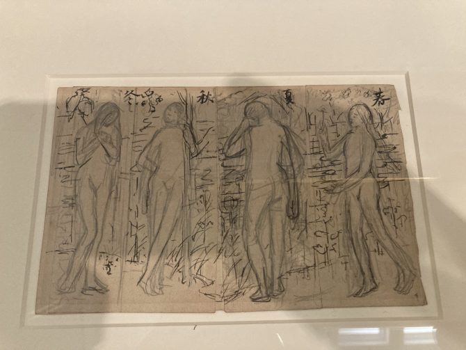5月6日。ゴールデンウィークのあいまの金曜日。5日の日記は書かなかったけれども、両日とも史料のデータを整理したのち、画像を見つめながら検討を進める。一昨日は上野の東京都美術館までとびらプロジェクトのASR(アートスタディルーム)でのワークに参加したのち、用事があったので、そのまま歩いて黒田記念館の常設展で、「春、夏、秋、冬(構図) 」を見た。右から四季の移り変わりを描いて、理想を具現しようという構想だろうか。人物の動きには鉛筆が重ねられていて何かを見定めようと抗っている。その背後には川だろうか、インクでアクセントをつけている。こうした止まった動きというものを胸に秘めながらまた歩いて日暮里近くの朝倉彫塑館を訪れる。8メートルほどだろうか、3階まであるアトリエから書庫をぬけて中庭にある池に面する。池には水が張ってあって、風だったり小さな噴水や鯉の動きだったりで水面がゆらぎをはらんでいる。黒田の鉛筆のあとを池の水面が追いかけているようで、こうした動きの連続がわたしのなかで灯しはじめたようだった。外に出てから歩くたびに風景がうつろうことそのことがとても心地よく思われた。
