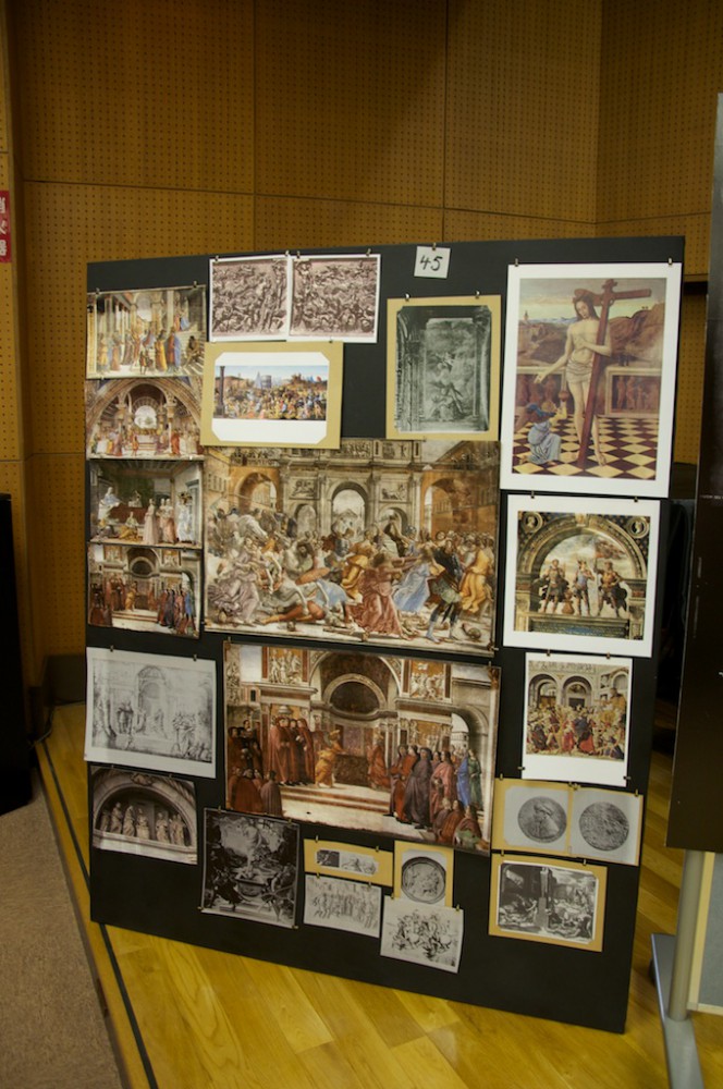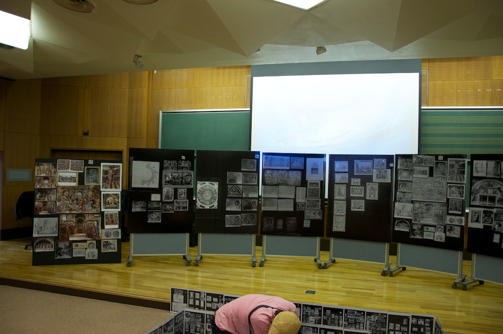 「アビ・ヴァールブルクの宇宙」で は、何か特別な仕掛けがあると予告されていたけれどもそれは、ほぼ原寸大(原寸より少し小さい)のパネル構築だった。全てのパネルではないが。写真を拡大しているだけだが迫力がある。ただ、左端のパネル45だけ、図版をとり、グリップもできるだけ同じものを使い、カラーであることを試みている。しかし、カラーになるとヴァールブルクが強調したい身ぶりについて見えにくくなるという解説が田中先生によってされていた(裏返していえば、モノクロにすることは大きな意味があるということ)。