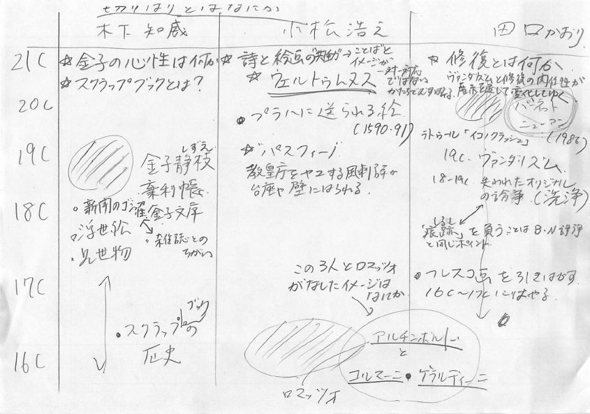 まず、パネル2が採用されたときに三人で顔合わせをしたいところだったが、わたしが関東、おふたりが関西にいるためにSkypeでそれぞれの研究構想をみっちりと話し合っていた。そのとき、わたしがSkypeで二人の話を咀嚼しながらメモしていたのが下のものになった。