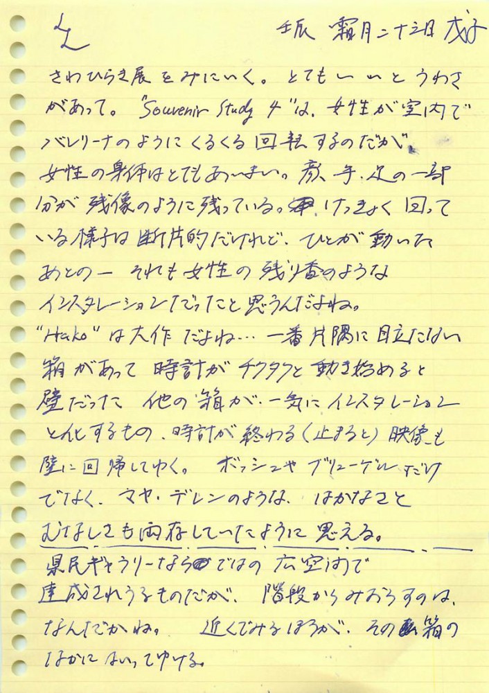 とあった。振り返って車窓から外を見上げたら、雲一つない空が広がっていた。ああ、おじいさん・・・台湾にいるから気をつかってくれたのかなと思いながら、芸大まで吉田晋之介さん《午前3時3分の底 -ひも億-》を見に行った。おかげで彼の絵と祖父の命日はつながっている。